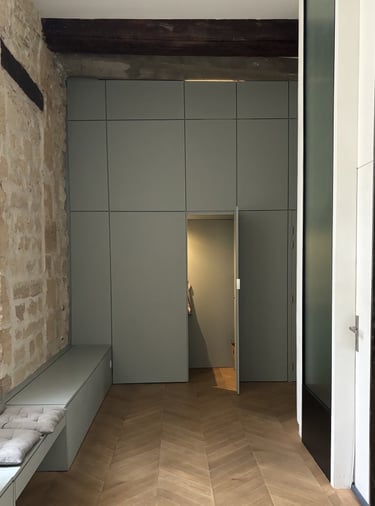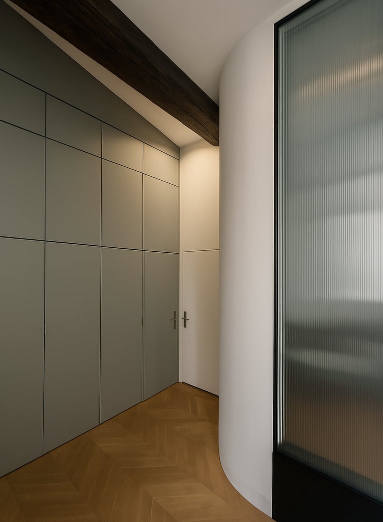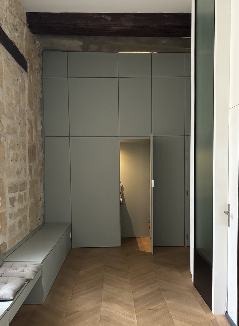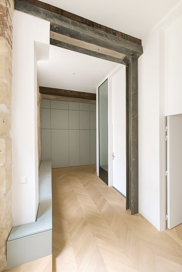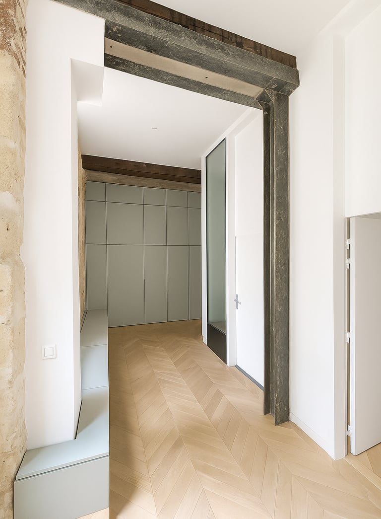 Ce projet a transformé un ancien commerce sans charme en un espace apaisant et fonctionnel pour trois psychologues. La salle d’attente, baignée de lumière grâce à une double exposition, relie les espaces par une courbe douce percée de grandes vitrages. Trois bureaux lumineux se succèdent avec fluidité, dans un univers brut mêlant pierre, métal, bois et verre. Un meuble toute hauteur, qui ferme la perspective depuis la salle d’attente, introduit une touche de couleur et d’unité, contrastant avec la matérialité brute du lieu